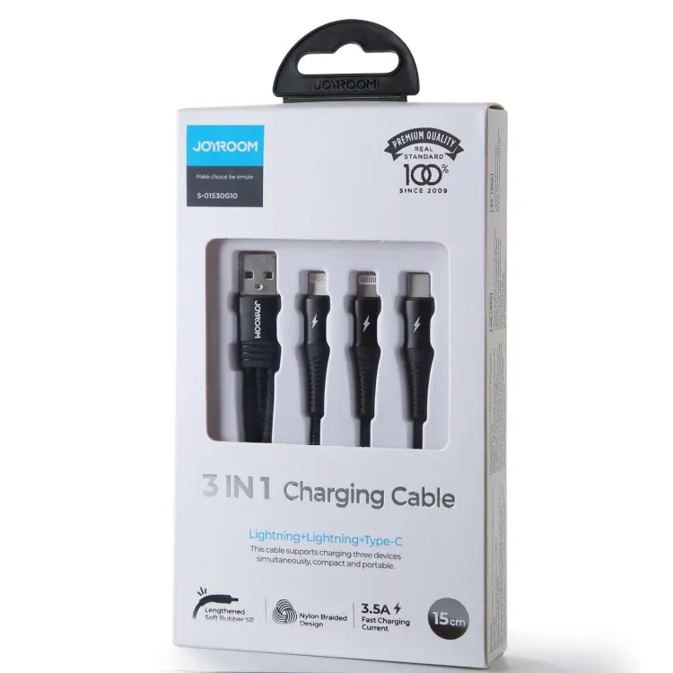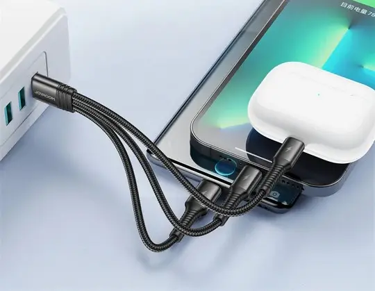 כבל 3 ב-1 איכותי מבית Joyroom עם יציאות אייפון, טייפ סי ומיקרו USB, תומך בטעינה מהירה ובעל עיצוב קומפקטי ונוח לשימוש. פתרון מושלם למכשירים שונים, מתאים לשימוש בבית, במשרד ובדרכים.