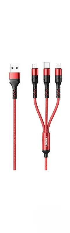 כבל טעינה מגנטי 3 ב-1 עם חיבורים מתחלפים: Type-C, מיקרו USB ואייפון. תומך בטעינה מהירה של 3.1A והעברת נתונים, באורך 120 ס"מ. זמין בצבע אדום, חום או שחור.
