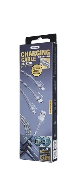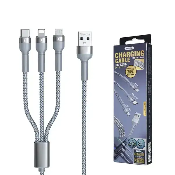 כבל הטעינה REMAX RC-124TH מסדרת Jany מציע פתרון נוח, עמיד ומעוצב לטעינה של עד שלושה מכשירים במקביל. כולל שלושה חיבורים: Type-C, Micro USB ו-אייפון (Lightning) – מתאימים למגוון רחב של סמארטפונים, טאבלטים, מצלמות ואפילו מחשבים ניידים.